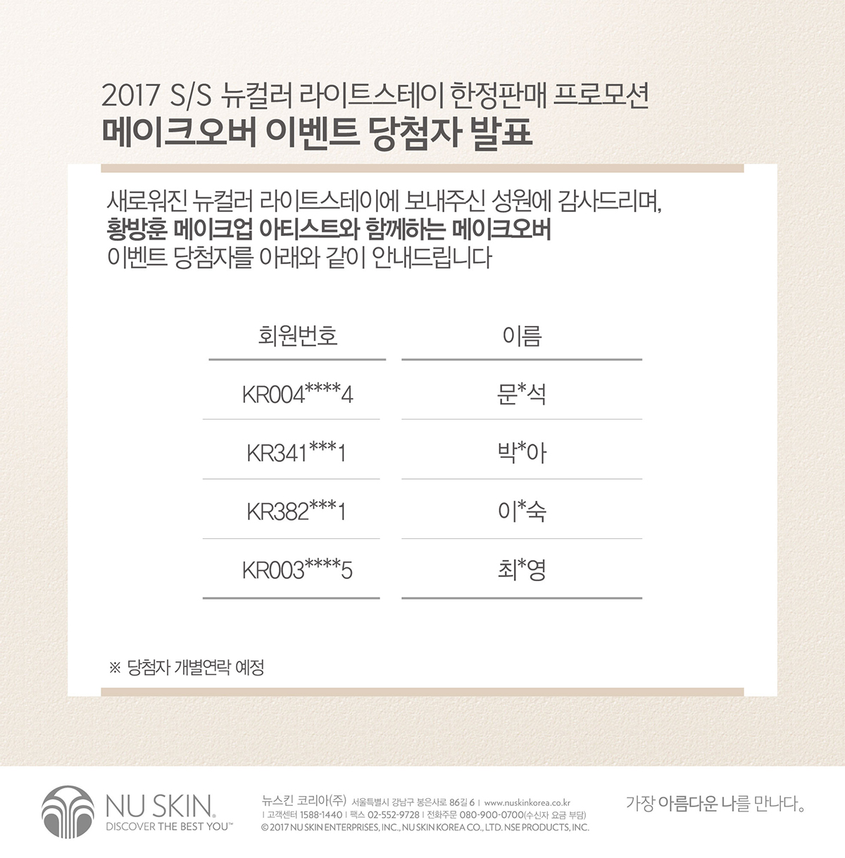 제목 2017 S/S 뉴컬러 라이트스테이 한정판매 프로모션 메이크오버 이벤트 당첨자 발표