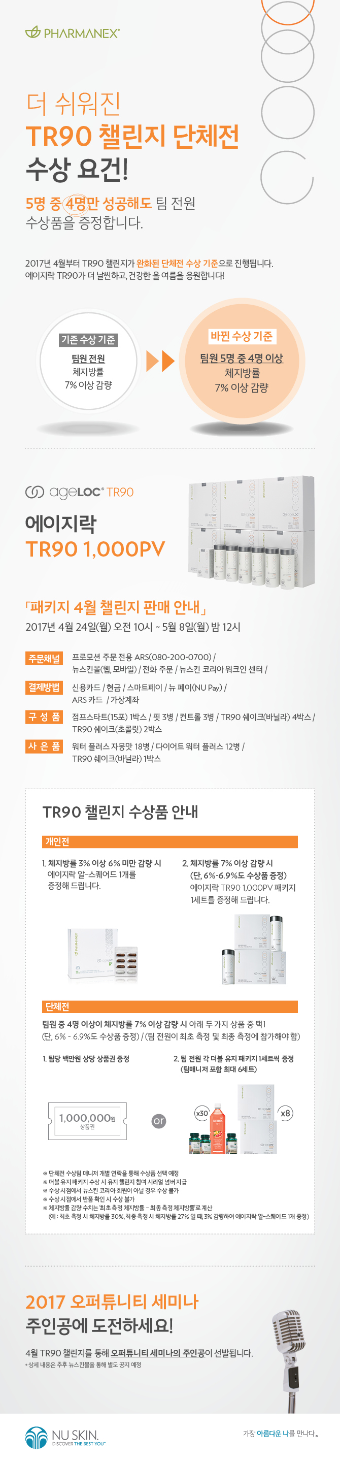 ![]() [ TR90 챌린지 홈페이지 바로가기 ] [ 에이지락 TR90 1000PV 패키지 구매 바로가기 ] 기타 궁금하신 사항은 콜센터 (주문, 상담업무: 1588-1440)로 문의하여 주시기 바랍니다. 감사합니다. |