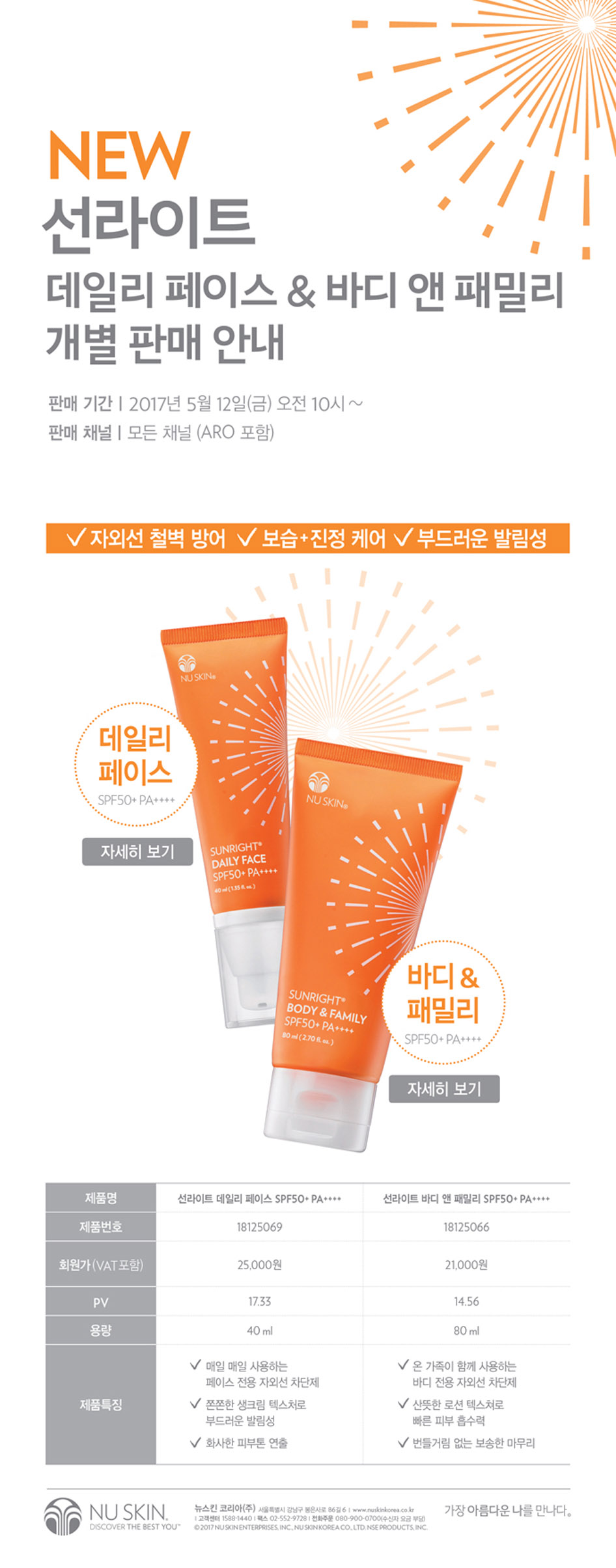 제목 선라이트 데일리 페이스 & 선라이트 바디 앤 패밀리 SPF50+ PA++++ 개별 판매