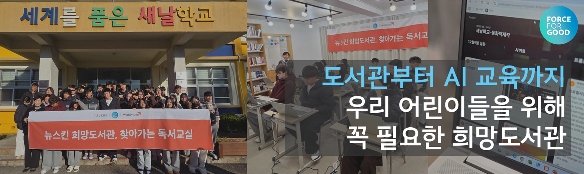 안녕하세요. 뉴스킨 코리아에서 알려 드립니다. 지난 12월 9일(화), 전남 광주에 위치한 제29호 뉴스킨 희망도서관인 ‘새날학교’에서 Nu Hope 프로젝트의 일환으로 희망도서관 독서교육 프로그램 ‘찾아가는 독서교실’이 진행되었습니다. ![]() 이번 프로그램은 AI를 활용한 ‘나만의 동화책 만들기’ 수업으로, 변화하는 시대와 트렌드에 맞춰 학생들이 AI를 올바르게 활용하는 방법을 배우고, 이를 바탕으로 자신만의 동화책을 직접 만들어 보는 교육으로 구성되었습니다. 뉴스킨 포스 포 굿 후원회의 기금으로 운영되고 있는 이 프로그램은 총 6교시 과정으로 연말까지 이어질 예정입니다. 올해는 새날학교 뿐만 아니라 제30호 희망도서관이 기증된 경남 거창 ‘좋은인연지역아동센터’를 대상으로 독서교육 프로그램이 진행될 예정이며, 제30호 희망도서관 어린이들을 위한 독서 연계 문화 체험 프로그램도 연내 운영될 예정입니다. 한편, ‘찾아가는 독서교실’은 기존에 건립된 희망도서관을 중심으로, 문화적, 교육적 혜택이 상대적으로 부족한 학생들을 위해 독서교육 프로그램을 추가로 지원하는 사업입니다. 희망도서관은 단순한 공간 조성에 그치지 않고, 개관 이후에도 지속적인 독서교육 프로그램을 통해 학생들의 성장을 꾸준히 지원하고 있습니다. 해당 프로그램은 2016년 시작 이후 총 58회 운영되었습니다. 뉴스킨 코리아와 뉴스킨 포스 포 굿 후원회는 앞으로도 어린이들의 건강과 웰니스를 위한 다양한 사회공헌 활동을 통해 아이들의 더 나은 미래를 응원해 나가겠습니다. 감사합니다. [Nu Hope 프로젝트] ‘Nu Hope 프로젝트’는 아이들의 건강과 웰니스를 위한 뉴스킨 포스 포 굿 후원회의 통합 사회공헌 프로젝트입니다. 주요 프로그램으로 뉴스킨 희망도서관, 뉴스킨 부모교육 다 엄마다, 사랑의 도시락이 있으며, 어린이의 풍성한 삶을 비전으로 하는 월드비전과 2023년 6월, 업무 협약을 맺고 함께 운영하고 있습니다. |