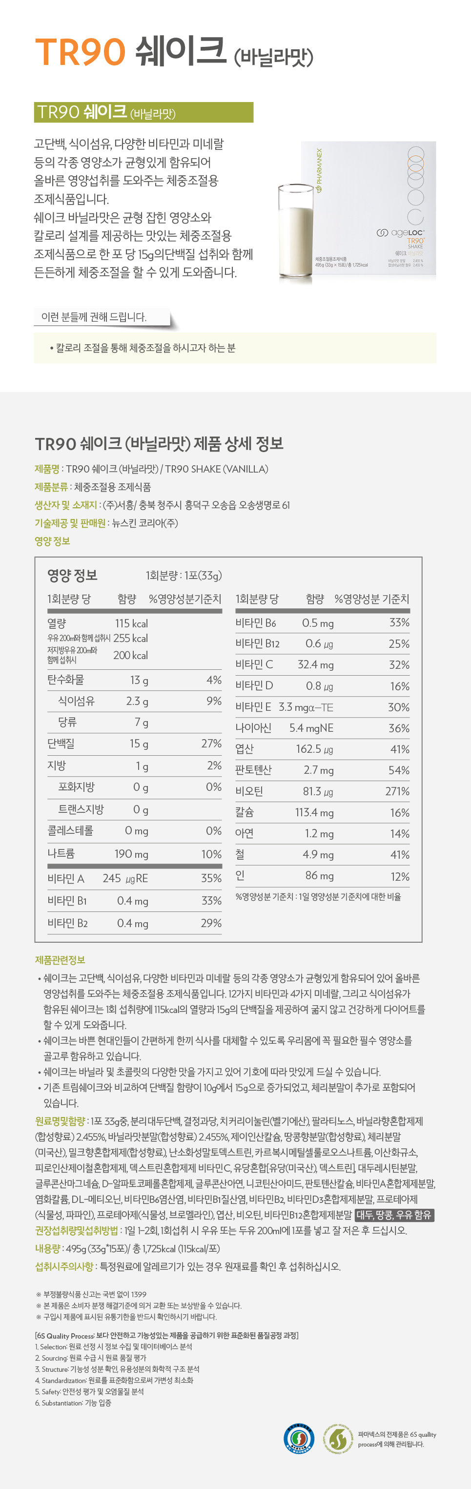한 포 당 15g의 단백질과 식이섬유, 다양한 비타민과 미네랄 등 각종 영양소가 균형있게 함유되어 올바른 영양 섭취를 도와주는 체중조절용 조제식품