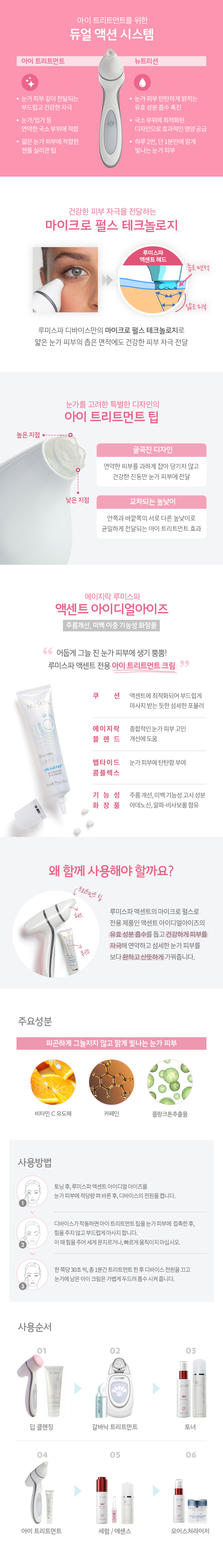 루미스파 액센트의 마이크로 펄스로 전용 제품인 액센트 아이디얼아이즈의 유효 성분 흡수를 돕고 건강하게 피부를 자극해 연약하고 섬세한 눈가 피부를 보다 환하고 산뜻하게 가꿔줍니다.